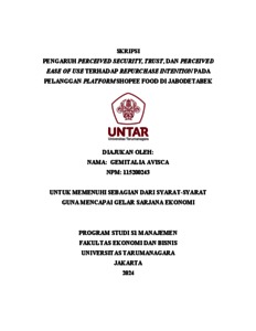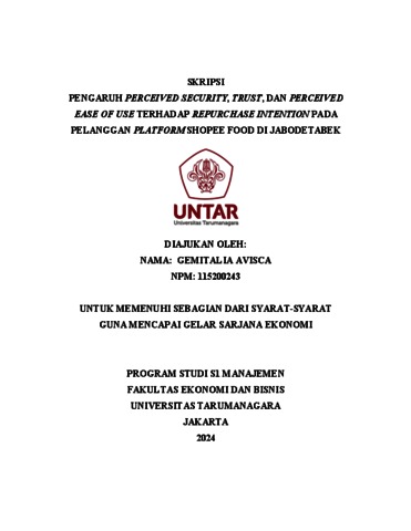 Avisca, Gemitalia (2023) PENGARUH PERCEIVED SECURITY, TRUST, DAN PERCEIVED EASE OF USE TERHADAP REPURCHASE INTENTION PADA PELANGGAN PLATFORM SHOPEE FOOD DI JABODETABEK. Skripsi thesis, Universitas Tarumanagara.