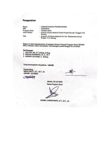 Prameswara, Caesar Dasha (2024) Analisis waste material pada proyek rumah tinggal x di Serang (TS - 2627). Skripsi thesis, Universitas Tarumanagara.