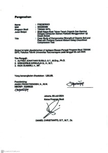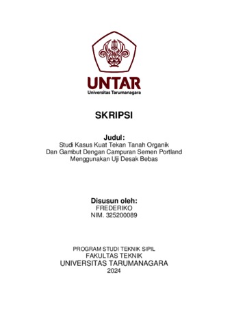 Frederiko, Frederiko (2024) Studi kasus kuat tekan tanah organik dan gambut dengan campuran semen portland menggunakan uji desak bebas (TS - 2631). Skripsi thesis, Universitas Tarumanagara.
