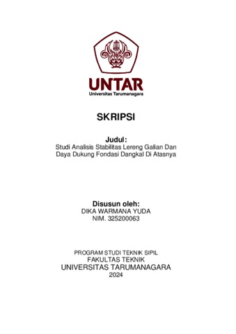 Yuda, Dika Warmana (2024) Studi analisis stabilitas lereng galian dan daya dukung fondasi dangkal di atasnya (TS - 2633). Skripsi thesis, Universitas Tarumanagara.
