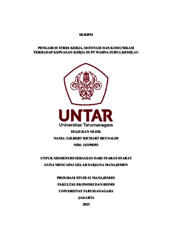 Reynaldi, Gilberti Richart (2023) PENGARUH STRES KERJA, MOTIVASI DAN KOMUNIKASI TERHADAP KEPUASAN KERJA DI PT WARNA SURYA KEMILAU. Skripsi thesis, Universitas Tarumanagara.