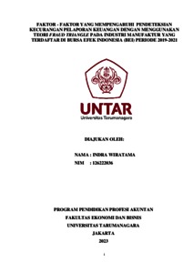 WIRATAMA, INDRA (2023) FAKTOR - FAKTOR YANG MEMPENGARUHI PENDETEKSIAN KECURANGAN PELAPORAN KEUANGAN DENGAN MENGGUNAKAN TEORI FRAUD TRIANGLE PADA INDUSTRI MANUFAKTUR YANG TERDAFTAR DI BURSA EFEK INDONESIA (BEI) PERIODE 2019-2021. Masters thesis, Universitas Tarumanagara.