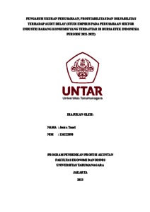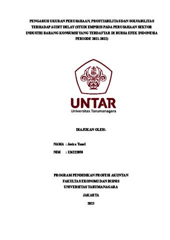 TANEL, JESICA (2023) PENGARUH UKURAN PERUSAHAAN, PROFITABILITAS DAN SOLVABILITAS TERHADAP AUDIT DELAY (STUDI EMPIRIS PADA PERUSAHAAN SEKTOR INDUSTRI BARANG KONSUMSI YANG TERDAFTAR DI BURSA EFEK INDONESIA PERIODE 2021-2022). Masters thesis, Universitas Tarumanagara.