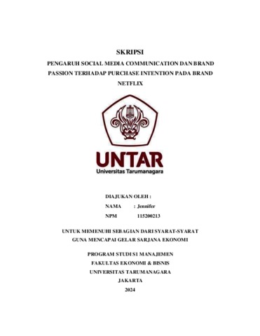 Jennifer, Jennifer (2023) PENGARUH SOCIAL MEDIA COMMUNICATION DAN BRAND PASSION TERHADAP PURCHASE INTENTION PADA BRAND NETFLIX. Skripsi thesis, Universitas Tarumanagara.