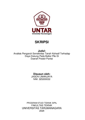 Limanjaya, Jason (2024) Analisis kepuasan sensitivitas tanah kohesif terhadap daya dukung pada batter pile di daerah pesisir pantai (TS - 2656). Skripsi thesis, Universitas Tarumanagara.