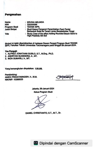 Melinda, Ervina (2024) Studi kasus pengaruh penambahan pasir pantai berbentuk bulat ke tanah lanau berplastisitas tinggi (TS - 2663). Skripsi thesis, Universitas Tarumanagara.