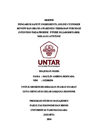 Rosyada, Maulin Amrina (2023) PENGARUH SAFETY INGREDIENTS, ONLINE CUSTOMER REVIEW DAN BRAND AWARENESS TERHADAP PURCHASE INTENTION PADA PRODUK N’PURE DI JABODETABEK MELALUI ATTITUDE. Skripsi thesis, Universitas Tarumanagara.