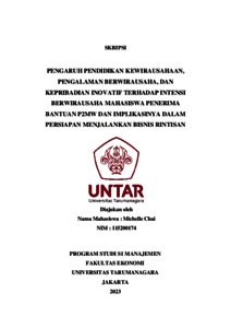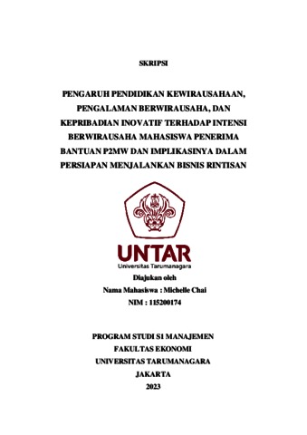 Chai, Michelle (2023) PENGARUH PENDIDIKAN KEWIRAUSAHAAN, PENGALAMAN BERWIRAUSAHA, DAN KEPRIBADIAN INOVATIF TERHADAP INTENSI BERWIRAUSAHA MAHASISWA PENERIMA BANTUAN P2MW DAN IMPLIKASINYA DALAM PERSIAPAN MENJALANKAN BISNIS RINTISAN. Skripsi thesis, Universitas Tarumanagara.