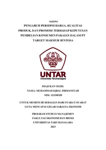 Firmansyah, Muhammad Iqbal (2023) PENGARUH PERSEPSI HARGA, KUALITAS PRODUK, DAN PROMOSI TERHADAP KEPUTUSAN PEMBELIAN KONSUMEN PAKAIAN DALAM PT TARGET MAKMUR SENTOSA. Skripsi thesis, Universitas Tarumanagara.