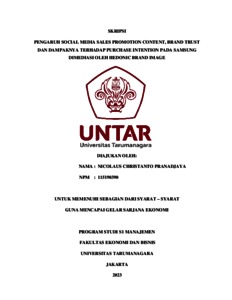 Pranadjaya, Nicolaus Christanto (2023) PENGARUH SOCIAL MEDIA SALES PROMOTION CONTENT, BRAND TRUST DAN DAMPAKNYA TERHADAP PURCHASE INTENTION PADA SAMSUNG DIMEDIASI OLEH HEDONIC BRAND IMAGE. Skripsi thesis, Universitas Tarumanagara.