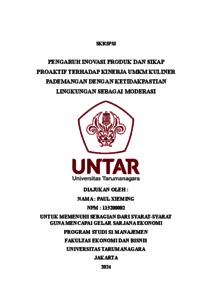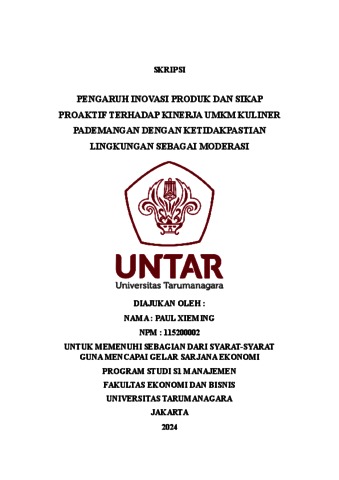 Xieming, Paul (2023) PENGARUH INOVASI PRODUK DAN SIKAP PROAKTIF TERHADAP KINERJA UMKM KULINER PADEMANGAN DENGAN KETIDAKPASTIAN LINGKUNGAN SEBAGAI MODERASI. Skripsi thesis, Universitas Tarumanagara.