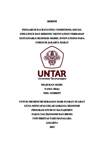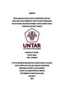 Ricky, Ricky (2023) PENGARUH FACILITATING CONDITIONS, SOCIAL INFLUENCE DAN HEDONIC MOTIVATION TERHADAP SUSTAINABLE BUSINESS MODEL INNOVATIONS PADA UMKM DI JAKARTA BARAT. Skripsi thesis, Universitas Tarumanagara.
