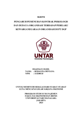 Deviana, Rosalina (2023) PENGARUH PEMENUHAN KONTRAK PSIKOLOGIS DAN BUDAYA ORGANISASI TERHADAP PERILAKU KEWARGANEGARAAN ORGANISASI DI PT DGP. Skripsi thesis, Universitas Tarumanagara.