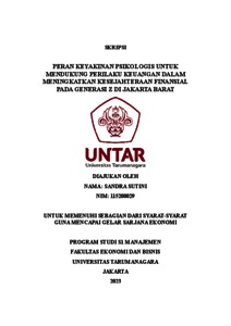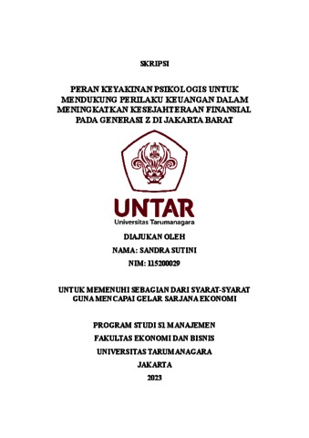 Sutini, Sandra (2023) PERAN KEYAKINAN PSIKOLOGIS UNTUK MENDUKUNG PERILAKU KEUANGAN DALAM MENINGKATKAN KESEJAHTERAAN FINANSIAL PADA GENERASI Z DI JAKARTA BARAT. Skripsi thesis, Universitas Tarumanagara.
