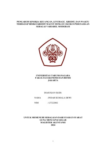 Dewi, Indah Kumala (2023) Pengaruh kinerja keuangan, leverage, kredit, dan waktu terhadap risiko kredit macet dengan ukuran perusahaan sebagai variabel moderasi. Masters thesis, Universitas Tarumanagra.