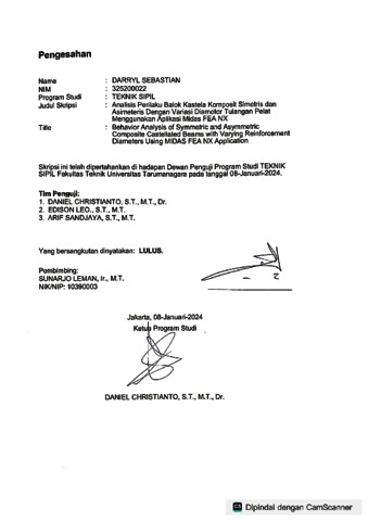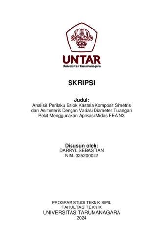 Sebastian, Darryl (2024) Analisis perilaku balok kastela komposit simetris dan asimetris dengan variasi diameter tulangan pelat menggunakan aplikasi midas fea nx (TS - 2672). Skripsi thesis, Universitas Tarumanagara.