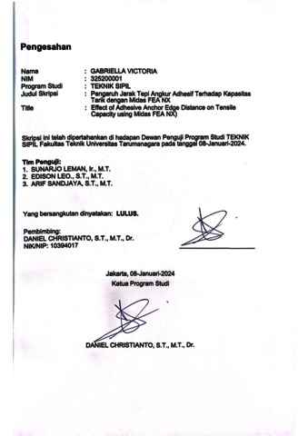 Victoria, Gabriella (2024) Pengaruh jarak tepi angkur adhesif terhadap kapasitas tarik dengan midas fea nx (TS - 2674). Skripsi thesis, Universitas Tarumanagara.