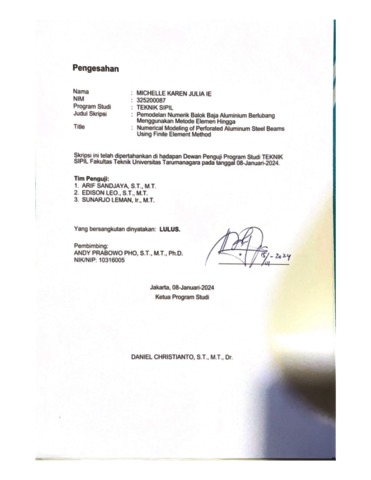 Julia, Michelle Karen (2024) Pemodelan numerik balok baja aluminium berlubang menggunakan metode elemen hingga (TS - 2675). Skripsi thesis, Universitas Tarumanagara.