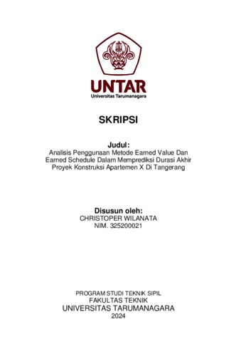 Wilanata, Christoper (2024) Analisis penggunaan metode earned value dan earned schedule dalam memprediksi durasi akhir proyek konstruksi apartemen x di Tangerang (TS - 2676). Skripsi thesis, Universitas Tarumanagara.