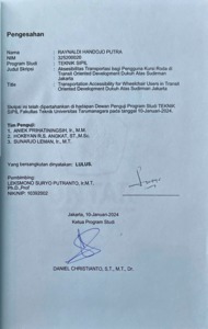 Putra, Raynaldi Handojo (2024) Aksesibilitas transportasi bagi pengguna kursi roda di transit oriented development Dukuh Atas Sudirman Jakarta (TS - 2678). Skripsi thesis, Universitas Tarumanagara.