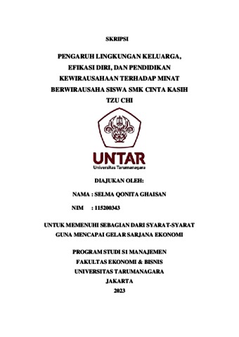 Ghaisan, Selma Qonita (2023) PENGARUH LINGKUNGAN KELUARGA, EFIKASI DIRI, DAN PENDIDIKAN KEWIRAUSAHAAN TERHADAP MINAT BERWIRAUSAHA SISWA SMK CINTA KASIH TZU CHI. Skripsi thesis, Universitas Tarumanagara.