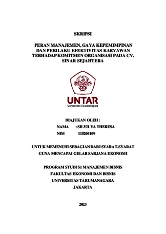 Theresa, Silvilya (2023) PERAN MANAJEMEN, GAYA KEPEMIMPINAN DAN PERILAKU EFEKTIVITAS KARYAWAN TERHADAP KOMITMEN ORGANISASI PADA CV. SINAR SEJAHTERA. Skripsi thesis, Universitas Tarumanagara.