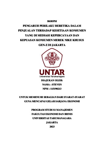 (E) Abstrak: Tujuan penelitian ini adalah untuk meneliti pengaruh kepercayaan dan perilaku beretika dalam penjualan terhadap kesetiaan konsumen merek Nike khusus Gen-z di Jakarta melalui mediasi kepuasan konsumen. Penelitian ini meneliti konsumen merek Nike khusus gen-z. Jumlah sampel yang digunakan sebanyak 265 responden dengan menggunakan teknik non-probability sampling dengan pendekatan purposive sampling. Penelitian ini merupakan penelitian kuantitatif dengan metode pengumpulan data menggunakan bantuan google form online dan analisa data menggunakan SEM (Structural Equation Modeling) dengan bantuan software SmarPLS 3. Hasil dari penelitian ini menunjukkan bahwa kepercayaan dan perilaku beretika dalam penjualan memiliki pengaruh yang signifikan terhadap kesetiaan konsumen merek Nike dengan mediasi kepuasan konsumen.