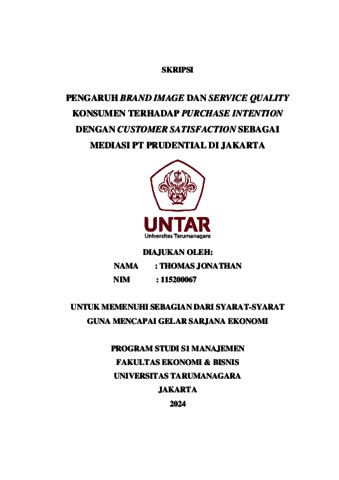 Jonathan, Thomas (2023) PENGARUH BRAND IMAGE DAN SERVICE QUALITY KONSUMEN TERHADAP PURCHASE INTENTION DENGAN CUSTOMER SATISFACTION SEBAGAI MEDIASI PT PRUDENTIAL DI JAKARTA. Skripsi thesis, Universitas Tarumanagara.