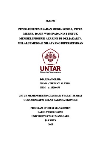 Alvera, Tiffany (2023) PENGARUH PEMASARAN MEDIA SOSIAL, CITRA MEREK, DAN E-WOM PADA NIAT UNTUK MEMBELI PRODUK AZARINE DI DKI JAKARTA MELALUI MEDIASI NILAI YANG DIPERSEPSIKAN. Skripsi thesis, Universitas Tarumanagara.