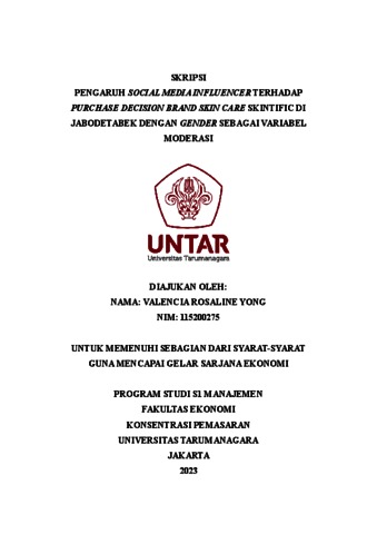 Yong, Valencia Rosaline (2023) PENGARUH SOCIAL MEDIA INFLUENCER TERHADAP PURCHASE DECISION BRAND SKIN CARE SKINTIFIC DI JABODETABEK DENGAN GENDER SEBAGAI VARIABEL MODERASI. Skripsi thesis, Universitas Tarumanagara.