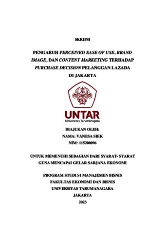 Siek, Vanesa (2023) PENGARUH PERCEIVED EASE OF USE, BRAND IMAGE, DAN CONTENT MARKETING TERHADAP PURCHASE DECISION PELANGGAN LAZADA DI JAKARTA. Skripsi thesis, Universitas Tarumanagara.