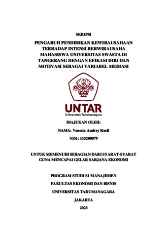 Rusli, Venesia Audrey (2023) PENGARUH PENDIDIKAN KEWIRAUSAHAAN TERHADAP INTENSI BERWIRAUSAHA MAHASISWA UNIVERSITAS SWASTA DI TANGERANG DENGAN EFIKASI DIRI DAN MOTIVASI SEBAGAI VARIABEL MEDIASI. Skripsi thesis, Universitas Tarumanagara.