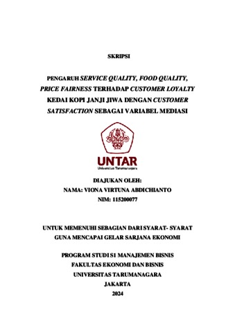 Abdichianto, Viona Virtuna (2023) PENGARUH SERVICE QUALITY, FOOD QUALITY, PRICE FAIRNESS TERHADAP CUSTOMER LOYALTY KEDAI KOPI JANJI JIWA DENGAN CUSTOMER SATISFACTION SEBAGAI VARIABEL MEDIASI. Skripsi thesis, Universitas Tarumanagara.