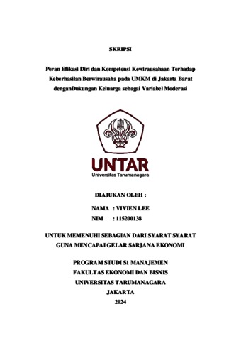 Lee, Vivien (2023) Peran Efikasi Diri dan Kompetensi Kewirausahaan Terhadap Keberhasilan Berwirausaha pada UMKM di Jakarta Barat denganDukungan Keluarga sebagai Variabel Moderasi. Skripsi thesis, Universitas Tarumanagara.