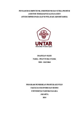 Utama, Iwan Yusia (2023) Pengaruh kompetensi, independensi dan etika profesi auditor terhadap kujalitas audit (studi emiris pada KAP di wilayah JABODETABEK). Masters thesis, Universitas Tarumanagara.