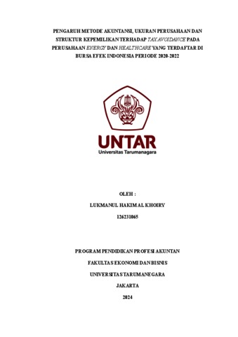 Al khoiry, Lukmanul Hakim (2023) Pengaruh metode akuntansi, ukuran perusahaan dan struktur kepemilikan terhadap tax avoidance pada perusahaan energy dan healthcare yang terdaftar di Bursa Efek Indonesia periode 2020-2022. Masters thesis, Universitas Tarumanagara.