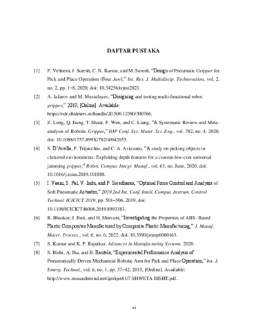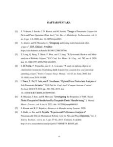 Penelitian ini bertujuan untuk merancang dan menganalisis jaw gripper pneumatik berbahan plastik ABS yang digunakan dalam sistem pick and place untuk mencapit objek berbentuk silinder dengan diameter 78 mm, tinggi 230 mm, dan berat 850 gram. Gripper pneumatik dirancang untuk memastikan penanganan yang stabil dan aman terhadap objek silinder tersebut. Analisis dilakukan menggunakan metode Finite Element Analysis (FEA) untuk memprediksi distribusi tegangan, regangan, deformasi, gaya reaksi, dan faktor keamanan gripper saat menangani beban yang telah ditentukan. Hasil simulasi menunjukkan bahwa jaw gripper mampu menahan beban tanpa mengalami kegagalan struktural dengan gaya pencapitan yang cukup. Deformasi maksimum terjadi pada area tumpuan baut, namun tetap berada dalam batas toleransi yang diizinkan. Penelitian ini menegaskan bahwa jaw gripper pneumatic berbahan plastik ABS merupakan solusi yang efektif dan aman untuk aplikasi pick and place dalam menangani objek silinder dengan spesifikasi yang diberikan. Temuan ini memberikan dasar yang kuat untuk pengembangan lebih lanjut dan implementasi dalam lingkungan industri yang memerlukan penanganan objek dengan presisi tinggi.