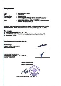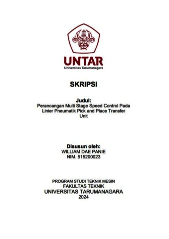 Panie, William Dae (2024) Perancangan multi stage speed control pada linier pneumatik pick and place transfer unit (TM - 1366). Skripsi thesis, Universitas Tarumanagara.