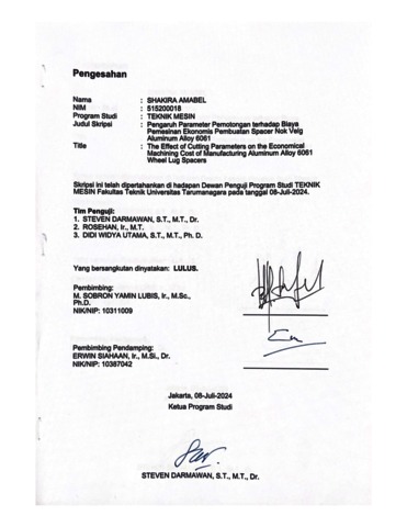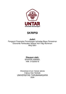 Amabel, Shakira (2024) Pengaruh parameter pemotongan terhadap biaya pemesinan ekonomis pembuatan spacer nok velg aluminum alloy 6061 (TM - 1367). Skripsi thesis, Universitas Tarumanagara.