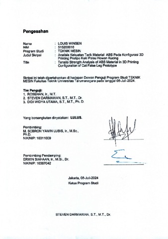 Winsen, Louis (2024) Analisis kekuatan tarik material abs pada konfigurasi 3d printing protipe kaki palsu hewan kucing (TM - 1377). Skripsi thesis, Universitas Tarumanagara.