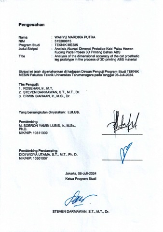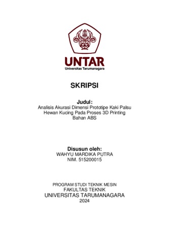 Putra, wahyu Mardika (2024) Analisis akurasi dimensi protipe kaki palsu hewan kucing pada proses 3d printing bahan abs (TM - 1378). Skripsi thesis, Universitas Tarumanagara.
