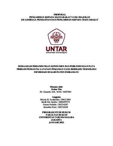 Gunardi, Lie and Syailendra, Moody R. and Aprilia, Indah Siti and Femilia, Naomi and Putri, Salsabila SOSIALISASI PERLINDUNGAN KONSUMEN DAN PERLINDUNGAN DATA PRIBADI PENGGUNA LAYANAN PINJAMAN UANG BERBASIS TEKNOLOGI INFORMASI DI KABUPATEN INDRAMAYU: Proposal PKM. Universitas Tarumanagara.
