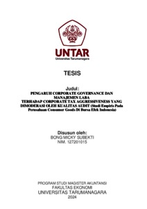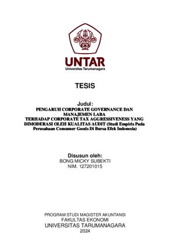 Subekti, Bong Micky (2023) Pengaruh Corporate Governance dan Manajemen Laba Terhadap Corporate Tax Aggressivenes Yang Dimoderasi oleh Kualitas Audit (Studi Empiris pada Perusahaan Consumer Goods di Bursa Efek Indonesia). Masters thesis, Universitas Tarumanagara.