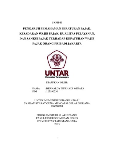 Winata, Bernaldy Nurhadi (2023) PENGARUH PEMAHAMAN PERATURAN PAJAK, KESADARAN WAJIB PAJAK, KUALITAS PELAYANAN, DAN SANKSI PAJAK TERHADAP KEPATUHAN WAJIB PAJAK ORANG PRIBADI JAKARTA. Skripsi thesis, Universitas Tarumanagara.