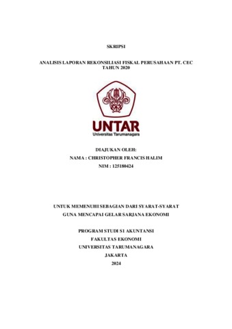 Halim, Christopher Francis (2023) ANALISIS LAPORAN REKONSILIASI FISKAL PERUSAHAAN PT. CEC TAHUN 2020. Skripsi thesis, Universitas Tarumanagara.