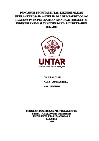 Sheila, Qonita (2023) Pengaruh profitabilitas, likuiditas, dan ukuran perusahaan terhadap opini audit going concern pada perusahaan manufaktur sektor industri farmasi yang terdaftar di BEI tahun 2022-2023. Masters thesis, Universitas Tarumanagara.