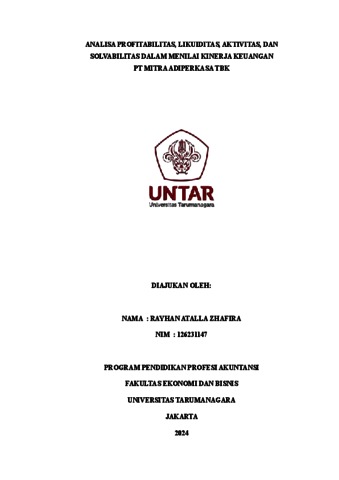 Zhafira, Rayhan Atalla (2023) Analisa profitabilitas, likuiditas, aktivitas, dan solvabilitas dalam menilai kinerja keuangan PT Mitra Adiperkasa TBK. Masters thesis, Universitas Tarumanagara.