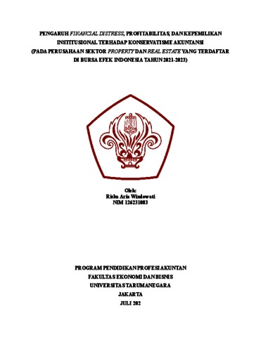 Windowati, Riska Aria (2023) Pengaruh financial distress, profitabilitas, dan kepemilikan institusional terhadap konservatisme akuntansi (pada perusahaan sektor property dan real estate yang terdaftar di Bursa Efek Indonesia tahun 2021-2023). Masters thesis, Universitas Tarumanagara.