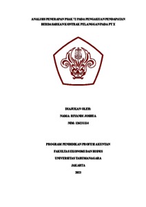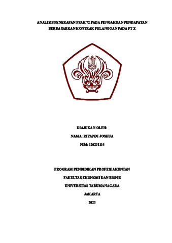 Joshua, Riyandi (2023) Analisis penerapan PSAK 72 pada pengakuan pendapatan berdasarkan kontrak pelanggan pada PT X. Masters thesis, Universitas Tarumanagara.
