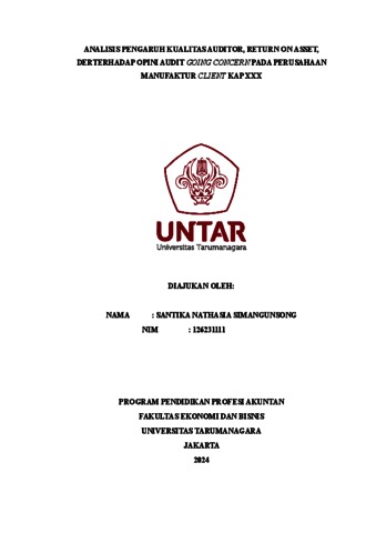 Simangunsong, Santika Nathasia (2023) Analisis pengarfuh kualitas auditor, return on asset, derterhadap opini audit going concern pada perusahaan manufaktur client KAP XXX. Masters thesis, Universitas Tarumanagara.